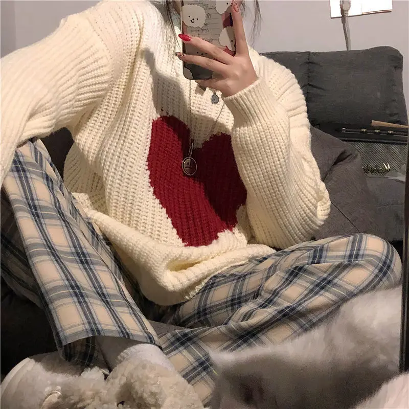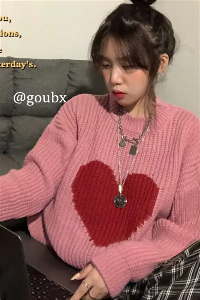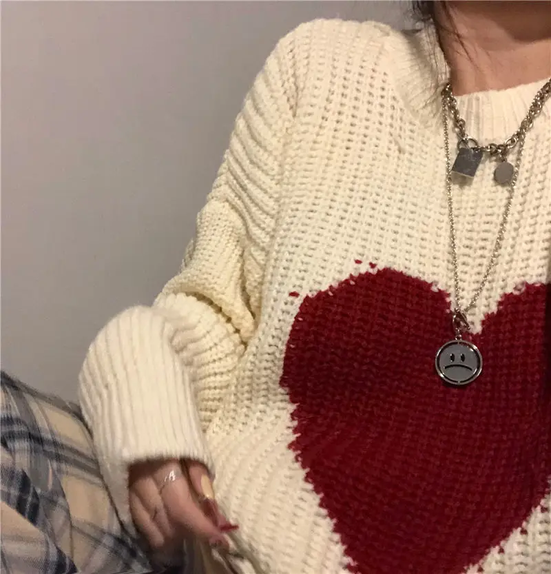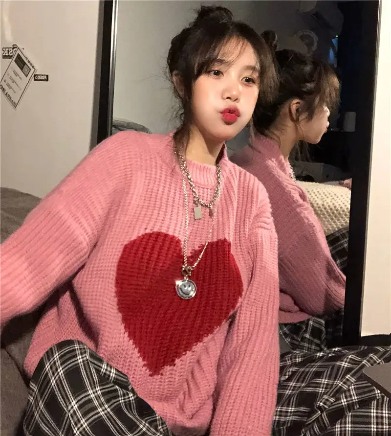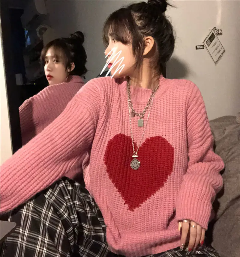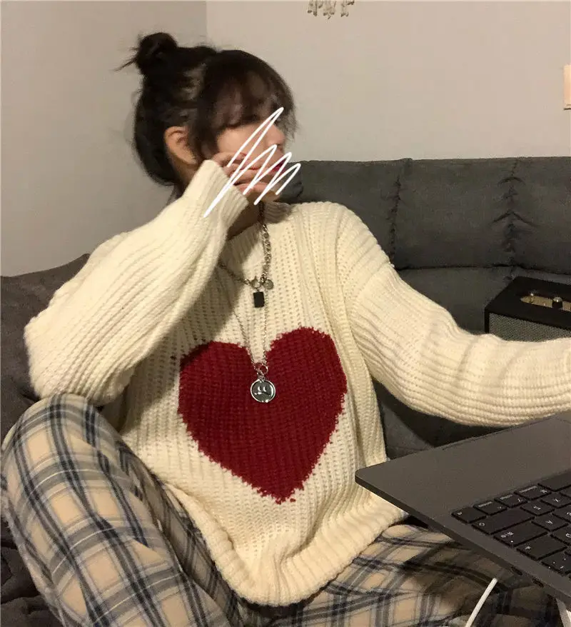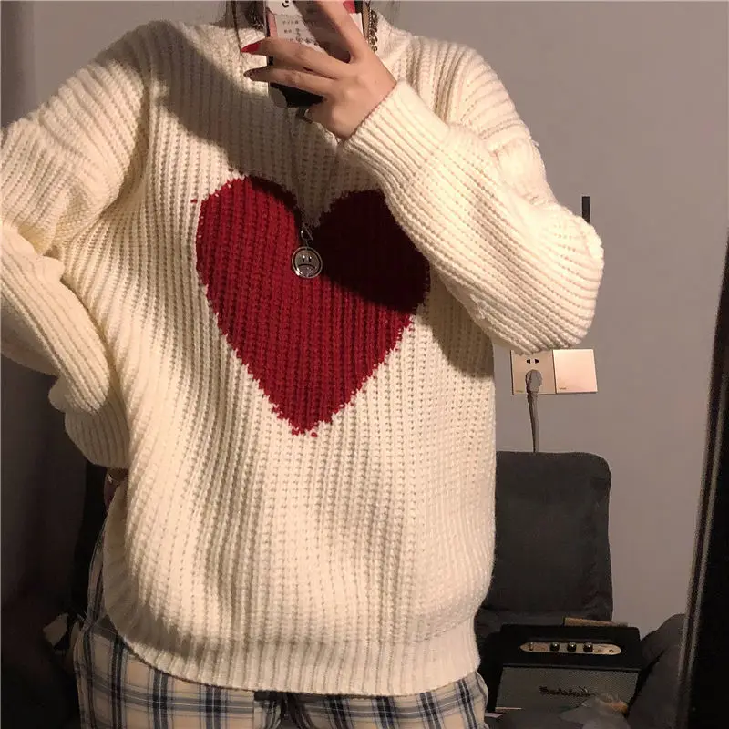 2021 Winter New Sweet Heart-Shaped Pattern Sweater Vintage Harajuku Style Full Sleeve Pullovers Loose Knitting Casual Sweater